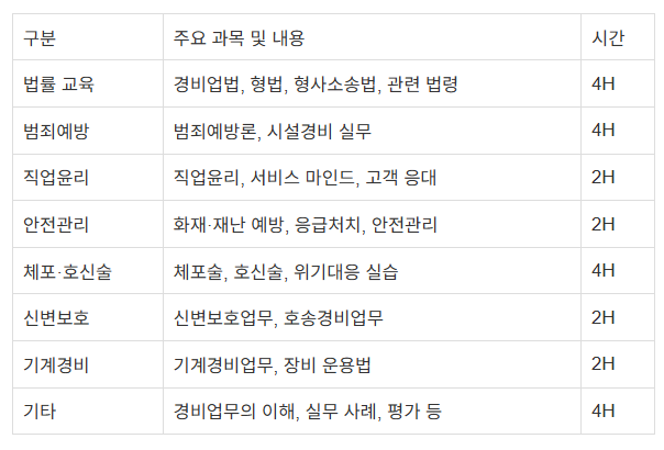 경비원 신임교육은 총 3일동안 24시간으로 진행됩니다. 과목은 아래 표로 정리해놓았습니다.
