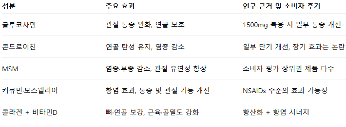 일반적으로 글루코사민은 일부 효과, 콘드로이친은 한정적, MSM은 소비자 만족도 높음, 커큐민·보스웰리아는 항염 탁월하다고 알려지고 있습니다.