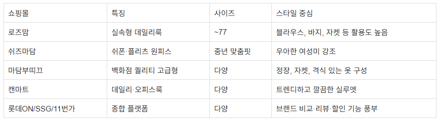 이 기준을 바탕으로 아래 50대 여성 의류 쇼핑몰 5군데를 추천드리겠습니다.
